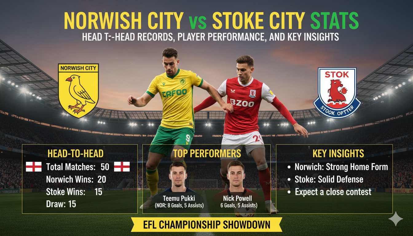The head-to-head record shows a competitive balance, with Norwich City generally performing better at home while Stoke City occasionally wins or draws away. Specific numbers can vary based on the season.